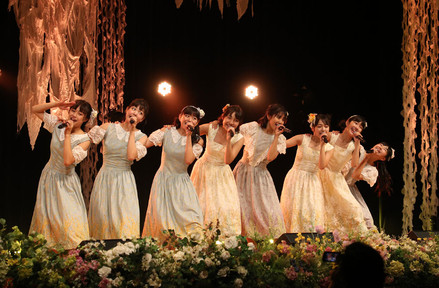 海賊をイメージしたという、トロピカルでカラフルな衣装に着替えて、「レモンドロップ」(オリジナル・アーティスト:アイドリング!!!)、「水平線でつかまえて」(同:三浦理恵子)、名曲「海へ行こう~Love Beach Love~」(同:チェキッ娘、作曲はレベッカの土橋安騎夫)などを快演。“この楽しい時間がずっと続きますように”という願いを込めて「夏休みは終わらない」(同:おニャン子クラブ)、「Let’s Party Time!」(16年7月リリース)へ。2曲とも寺島和花の歌唱に引き込まれた。今後のハコムスの歌唱面は彼女や依田彩花を軸として動いていくのでは、という気がする。オーラスの「旅をつなげて」(17年4月リリース)は、我妻の熱い歌い出しが印象的な一曲。後半部分で再び卒業生が登場し、場内のエモーションをさらに高めた。