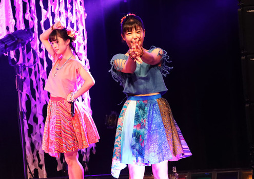 「ハコいっぱいのプレゼント」(16年10月リリース)、「泣かないでエンジェル」(オリジナル・アーティスト:Qlair)、「無言のファルセット」(同:CoCo)、「Be My Diamond!」(同:ribbon)をさわやかに披露して、我妻以外のメンバーは退場。かわって門前亜里(15年7月卒業)、内山珠希(16年3月卒業)、神岡実希(17年5月卒業)、鉄戸美桜(18年3月卒業)が登場する。小松もか(16年7月卒業)は客席からそれを見ている。“昔とおんなじ自己紹介をしてよ”という我妻の無茶振りに4人は照れながらも応え、「君の歌、僕の歌」(同:CoCo)、この季節に欠かせない極上夏ソングのひとつ「夏色キッス」(同:アイドリング!!!。複数のメロディが重なって絡み合うところが実に美しい)を歌った。それにしてもこの4人が再びアイドルとしてステージに立つ機会を見ることができようとは。加えて内山のギャル+セレブ的装い、往年よりも一段とワイルドさと切れ味を増したぶっちゃけキャラに出会えるとは。