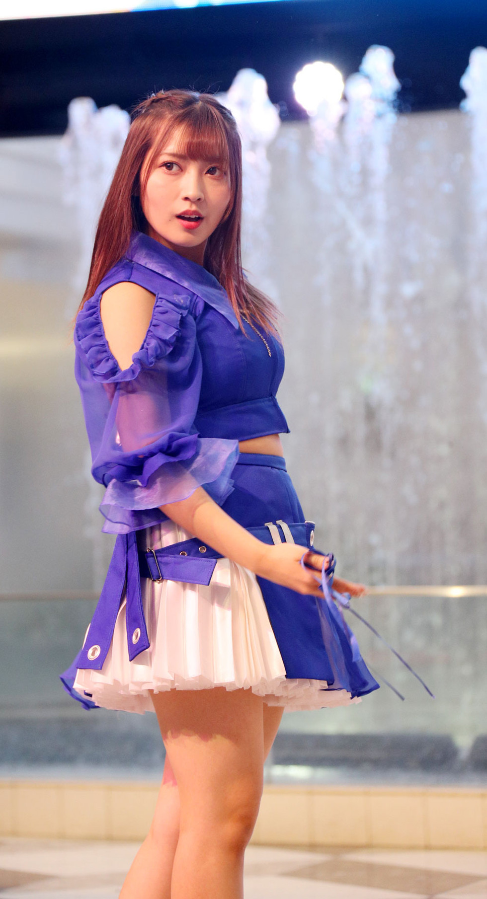 佐倉みき はいっ! 衣装さんが、「未来航路」のイメージ――空、海――に合わせて、ブルー系で作ってくださったんですけど、実は一人ひとり色味(濃度?)が違うんです(集合カット右「星凪」が一番濃く、左に行くにつれて薄くなり、佐倉が一番淡くなる)。私は水色が一番好きなので、この色に合わせてもらってすごくうれしいです。