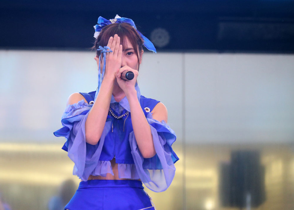 イベントは18時に開始。新曲に合わせたブルー系の新衣装に身を包んだメンバーは、恒例のSEに乗って颯爽と登場。ニューシングル収録曲でもある「愛情イマジネイション」から歌唱をスタートだ。リフレインされる「いないの」という歌詞と、途中にはさまれるかわいらしい「どこかに消えてくれ!」のフレーズが特徴的な作品。