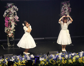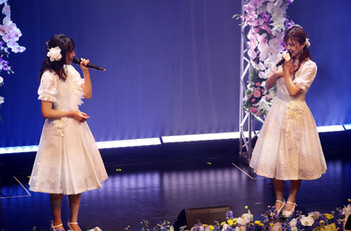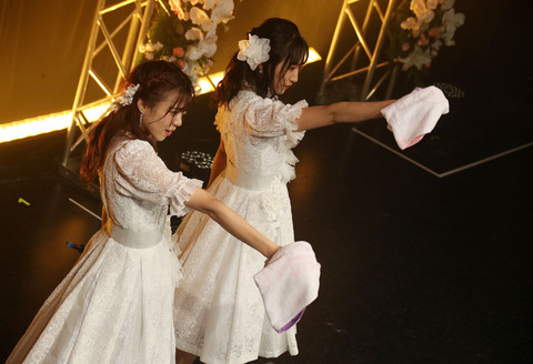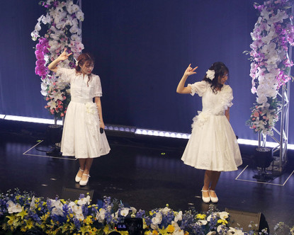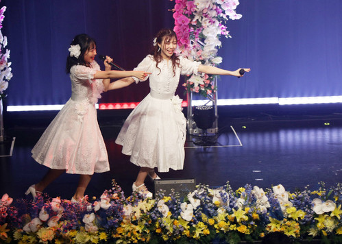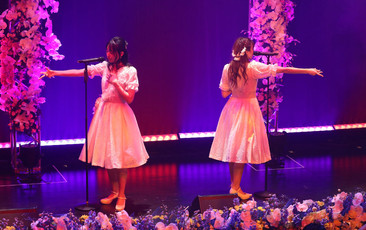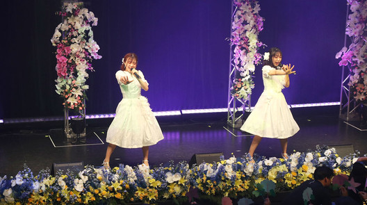 昼の部が終了し、ハイタッチでファンを見送ったあと、60数分で夜の部が始まった。いよいよ、これがラスト・セットなのだ。14時開始のステージとはまったくダブらない、計29曲。同じように初期と近年のナンバーをバランスよく、いくつかセクションを組みながら送り届ける。「Tactics」、「ふわふわ♪Party」、「2月のエピローグ」、「菫アイオライト」、本当に幅広い。何グループ分に相当するであろう多彩な曲想を、このふたりは歌いこなしてきたんだなと実感させられる。